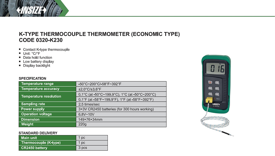 0320-K230 thermocouple ±2.0°С/±3.6°F 1 -50°С~200°С/-58°F~392°F