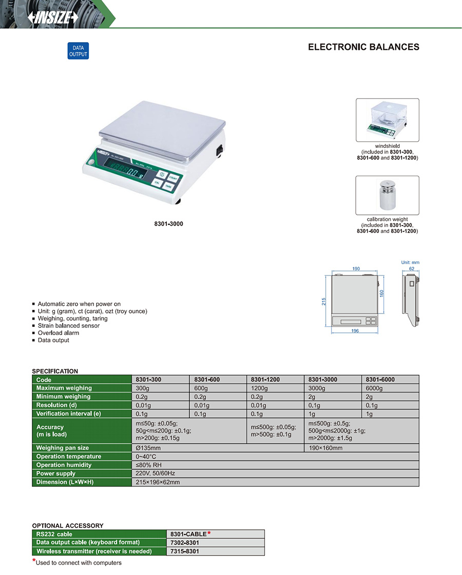 Code Resolution Maximum weighing Dimension of pan Internal calibration