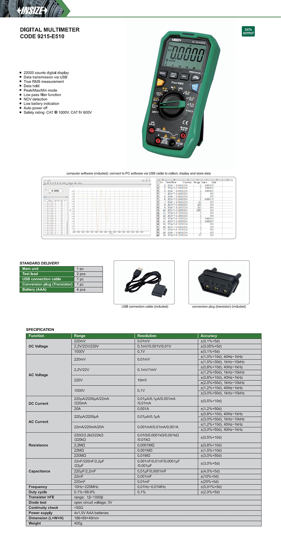9215-E510 4 ½ 20A 20A 1000V 1000V ±(0.05%+5d) no yes USB
