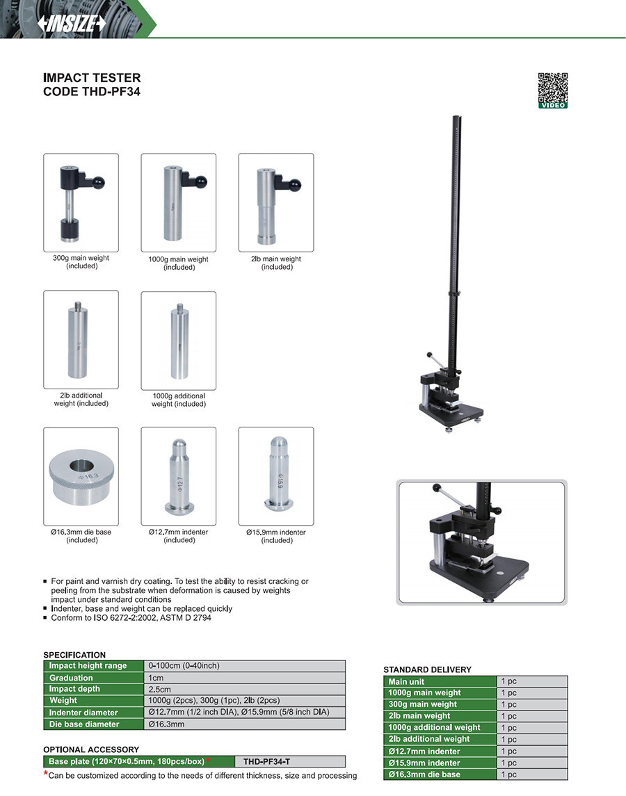 Code Weight Impact height range Indenter diameter