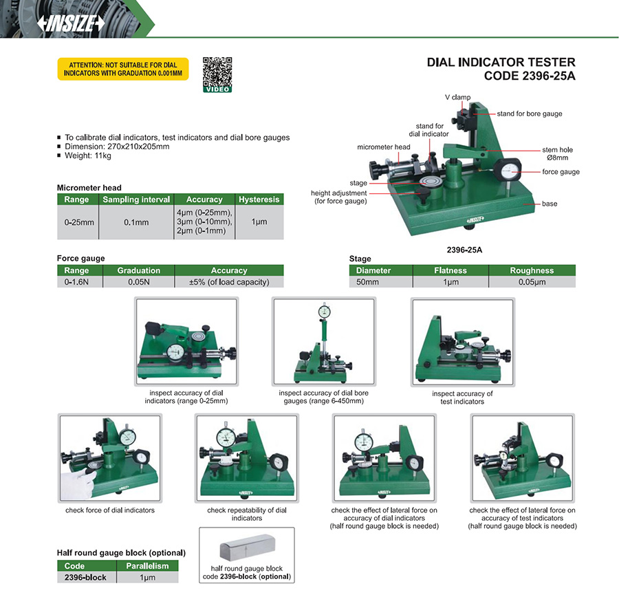 2396-25A micrometer head: 0-25mm; force gauge: 0-1.6N micrometer head: 4µm (0-25mm), 3µm (0-10mm), 2µm (0-1mm); force gauge: ±5% (of load capacity)