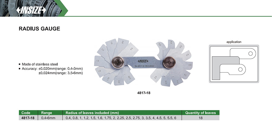 | 4817-18 | 0.4-6mm | 0.4, 0.8, 1, 1.2, 1.5, 1.6, 1.75, 2, 2.25, 2.5, 2.75, 3, 3.5, 4, 4.5, 5, 5.5, 6 |