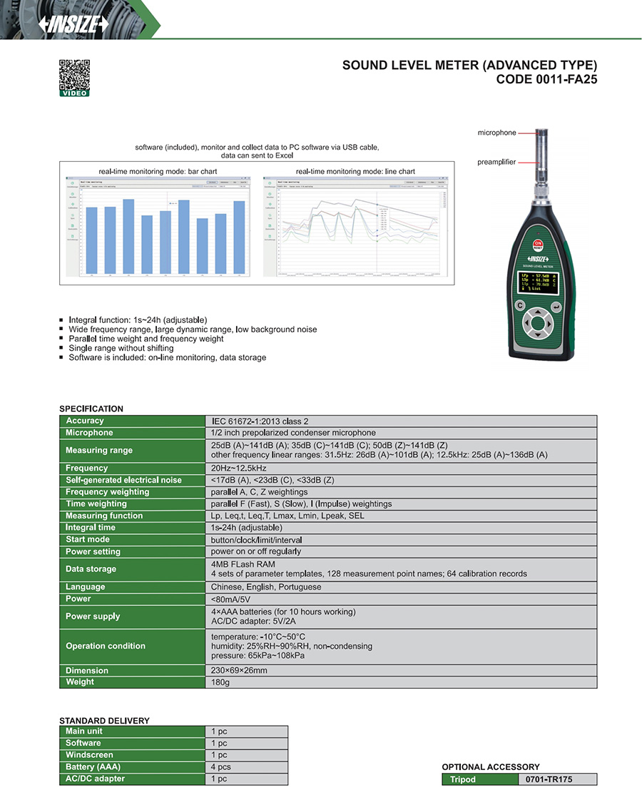 | 0011-FA25 | IEC 61672-1:2013 class 2 | 20Hz~12.5kHz | parallel A, C, Z weightings | yes |