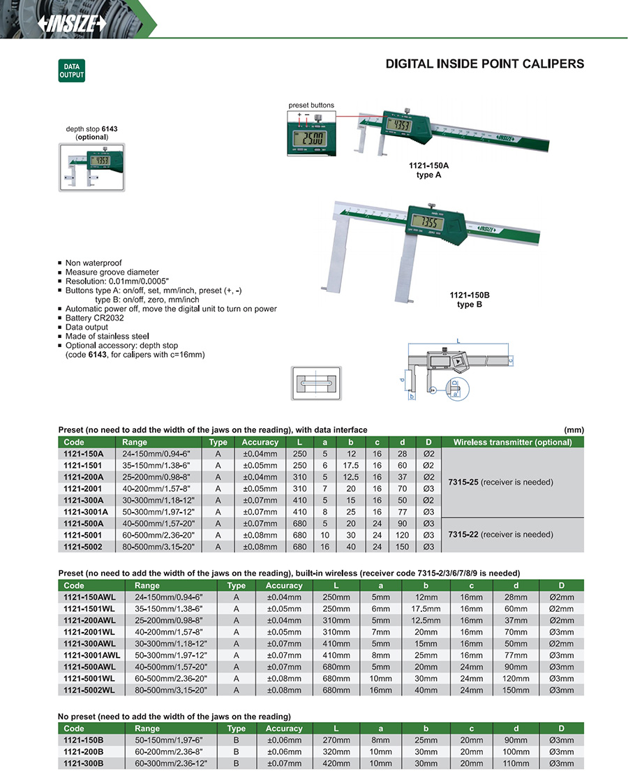 1121-150A A 24-150mm/0.94-6" ±0.04mm 0.01mm/0.0005" with data interface
