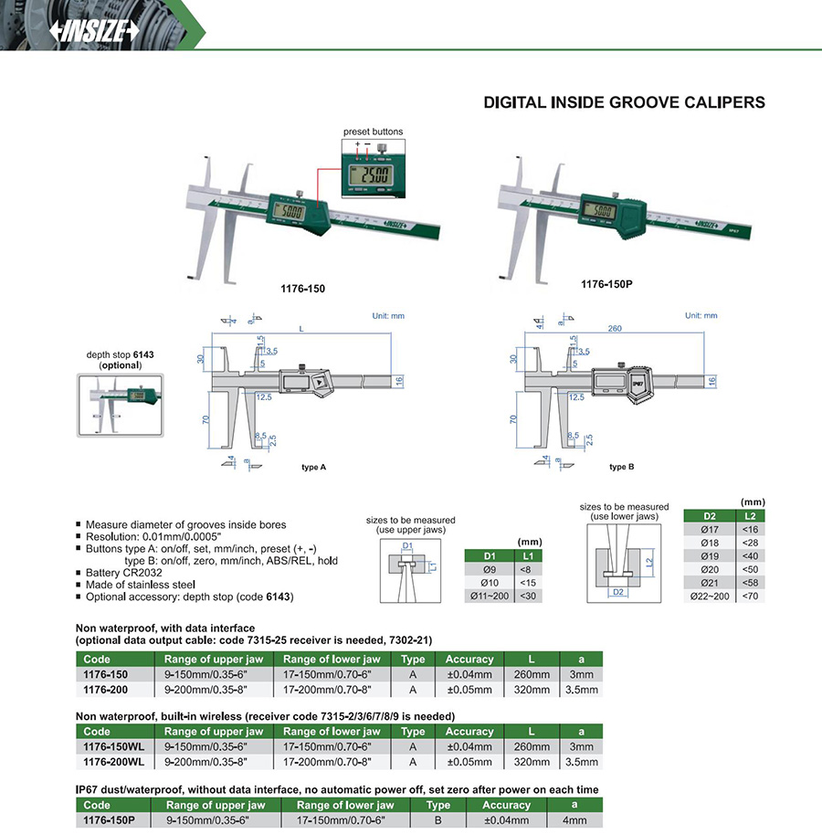 | 1176-150 | A | 9-150mm/0.35-6" | 17-150mm/0.70-6" | ±0.04mm | 0.01mm/0.0005" | with data interface |