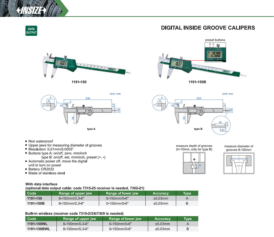 1191-150B B 8-150mm/0.3-6" ±0.03mm 0.01mm/0.0005" with data interface
