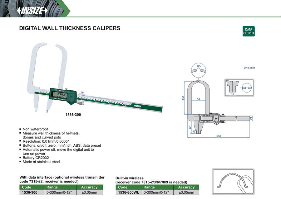 | 1536-300WL | 0-300mm/0-12" | ±0.05mm | 0.01mm/0.0005" | built-in wireless |