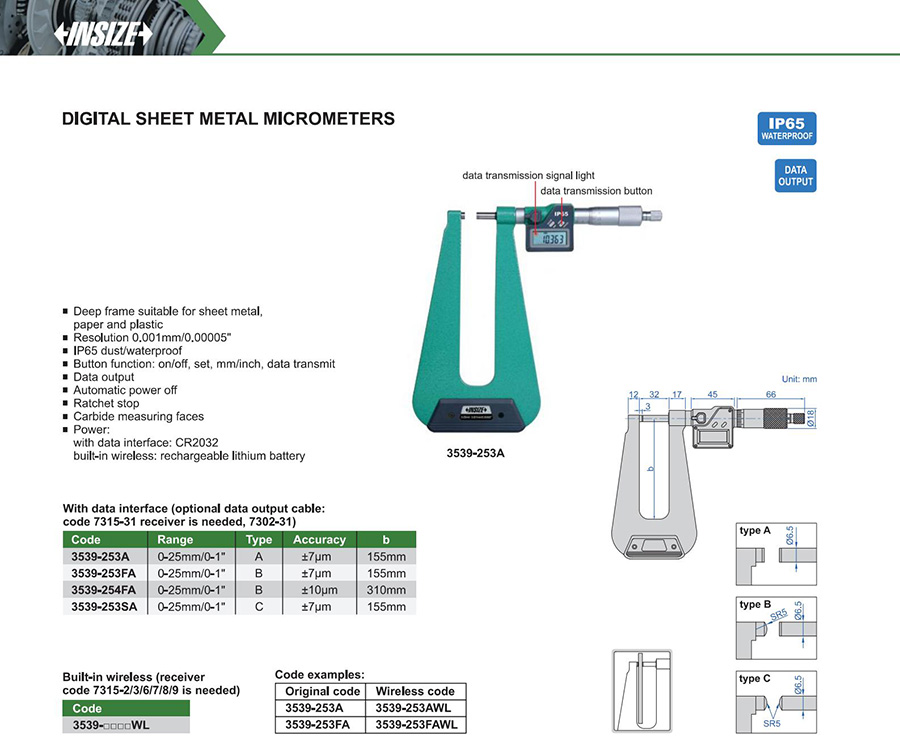 3539-253FAWL B 0-25mm/0-1" ±7μm 0.001mm/0.00005" built-in wireless
