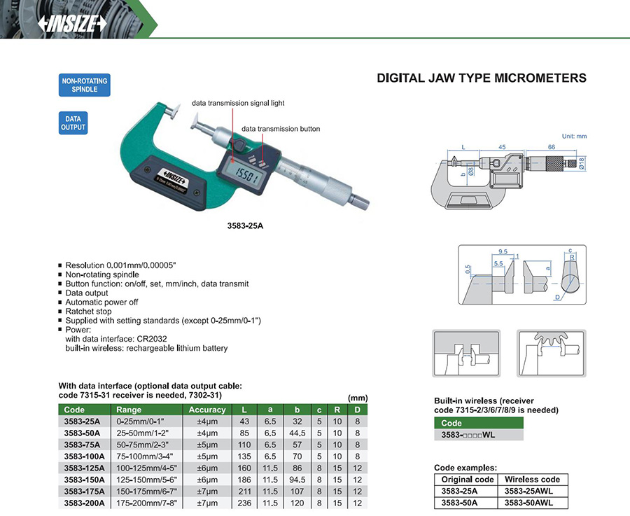 | 3583-50AWL | 25-50mm/1-2" | ±4μm | 0.001mm/0.00005" | built-in wireless |