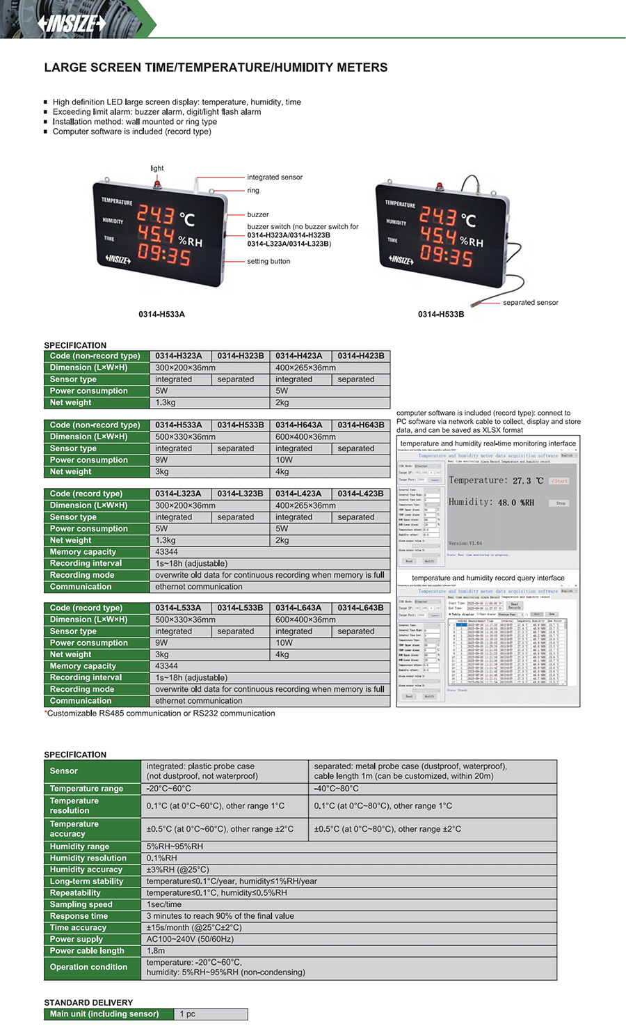 | 0314-H423A | digital | integrated | 400×265×36mm | ±0.5°С (at 0°С~60°С), other range ±3°С | 5%RH~95%RH | ±3%RH (@25°С) | - | yes | -20°С~60°С |
