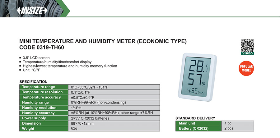 0319-TH60 digital internal ±0.5°C/±0.9°F 0%RH~99%RH (non-condensing) ±5%RH (at 10%RH~90%RH), other range ±7%RH 0°C~55°C/32°F~131°F