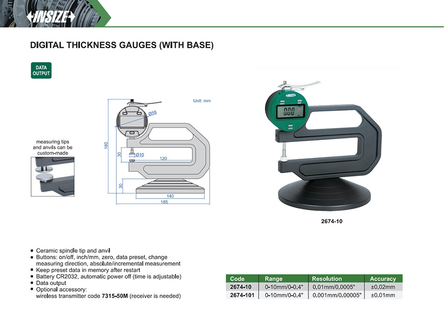 | 2674-10 | 0-10mm/0-0.4" | ±0.02mm | 0.01mm/0.0005" |
