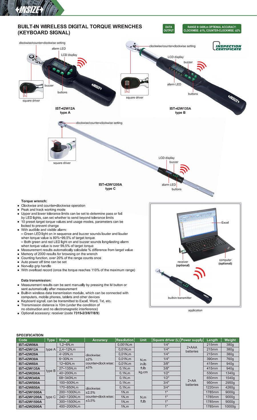 | IST-42W2000A | digital | 400~2000N.m | wireless transmission (keyboard signal) | digital display | fixed ratchet head |