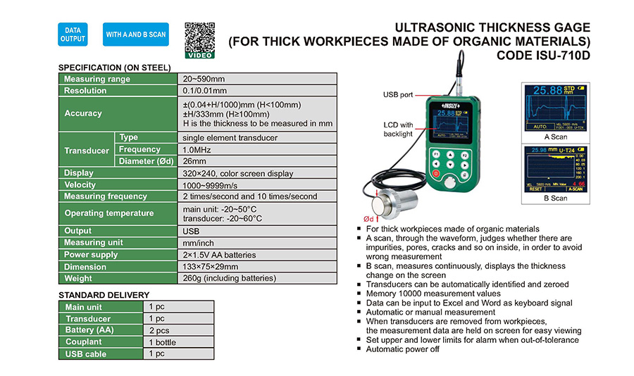 | ISU-710D | 20~590mm | ±(0.04+H/1000)mm (H<100mm), ±H/333mm (H≥100mm) | 1.0MHz | USB | 1000~9999m/s | 26mm |