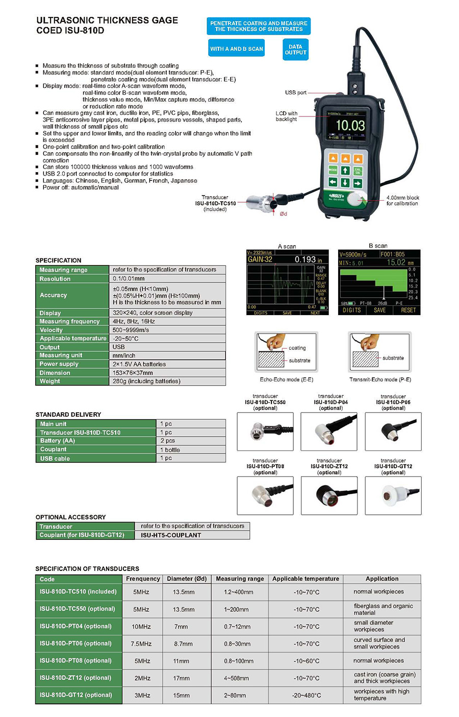 ISU-810D 1.2~400mm ±0.05mm (H<10mm), ±(0.05%H+0.01)mm (H≥100mm) 5MHz USB 500~9999m/s 13.5mm